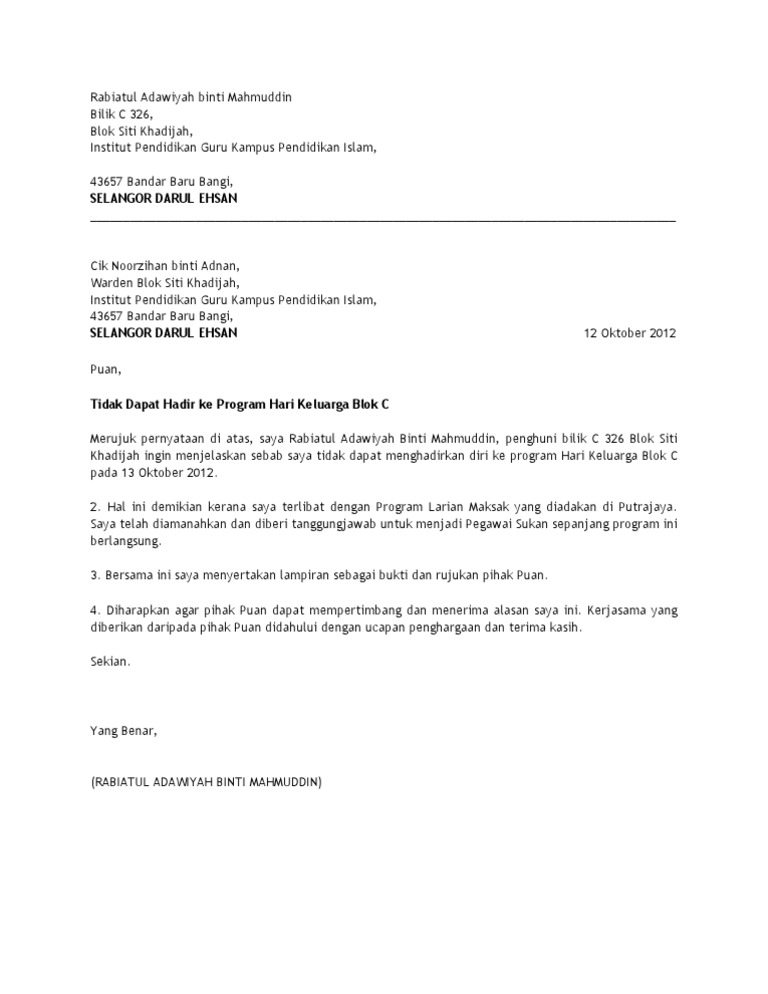 Ketidakhadiran tuanpuan pada tarikh di atas boleh dikenakan tindakan. Surat Tunjuk Sebab Lewat Hadir Kerja. Saya Hazirah Binti Amir tidak dapat hadir ke PPV Axiata Arena sebagai sukarelawan pada hari Selasa 15 Julai 2021.